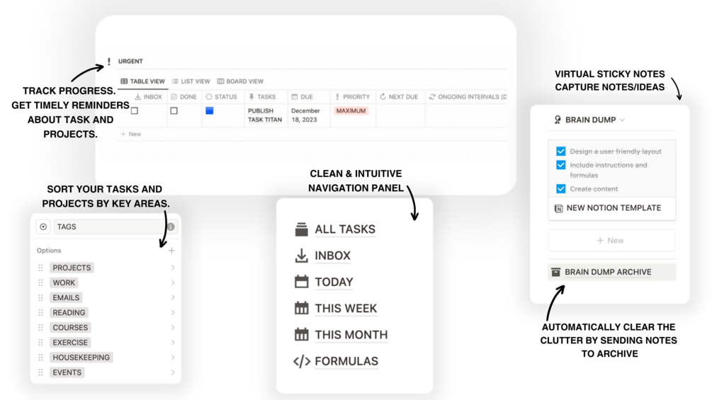 Transform your task management experience with this template's advanced features! Gain a crystal-clear view of your tasks by effortlessly tracking their status, grouping them by areas, and prioritizing them with precision. Seamlessly navigate parent and sub-tasks, and witness the power of enhanced organization. With the ability to set recurring due dates, our template ensures that no task is ever overlooked.