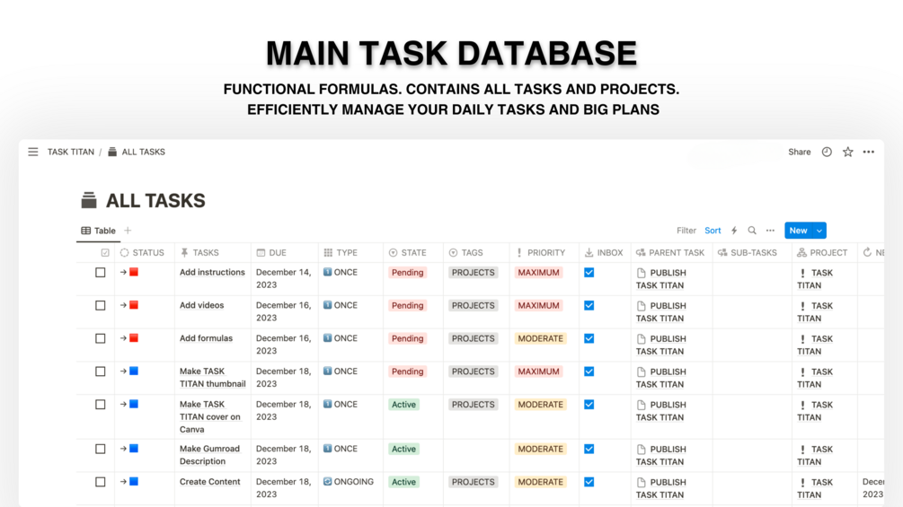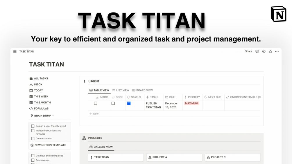 Use TASK TITAN to effortlessly organize and prioritize your tasks and projects. This template provides a system for efficient planning, allowing you to stay on top of deadlines and achieve your goals with ease. Elevate your productivity, eliminate the clutter, and experience the satisfaction of a well-organized work life.